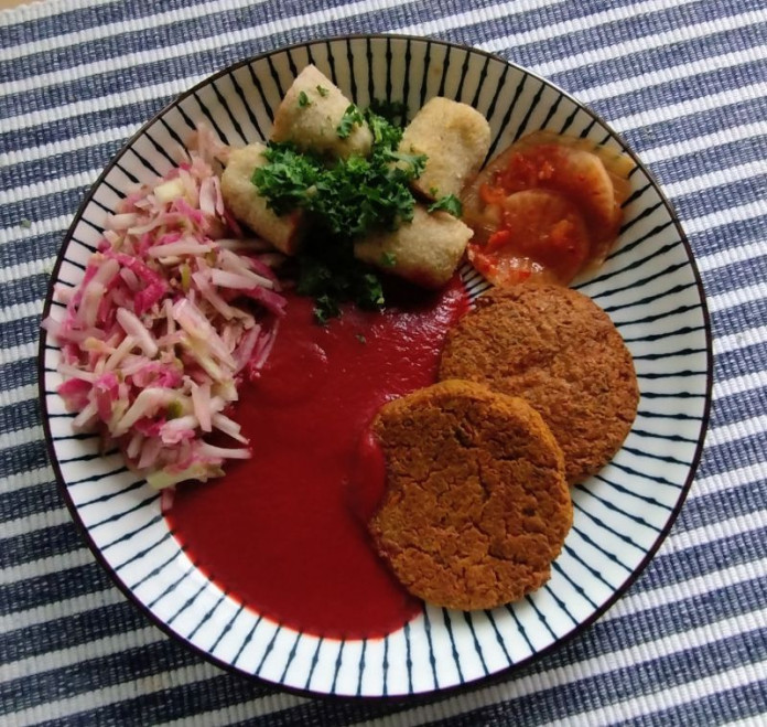 Výborná omáčka, nechápu, proč jsem ji zkusila teprve dnes. Přidala jsem dýni, hřebíček a skořici a chuťově to opravdu rajskou připomínalo hodně. Barevně ovšem pořad vede řepa 🤭. S dýňovým burgerem a jáhlovými knedlíčky to byl moc dobrý oběd😋. Určitě jsem ji nedělala naposled.🥰