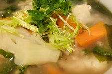 2. Do horkého vývaru dáme trošku soli, řasu wakame, mrkev a květák nakrájený na malé kousky.