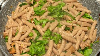 - Uvařte těstoviny, sceďte (trochu vody nechte stranou). Přidejte těstoviny do pánve i s několika lžícemi vody z vaření těstovin. Promíchejte, zvyšte plamen a vše řádně orestujte.