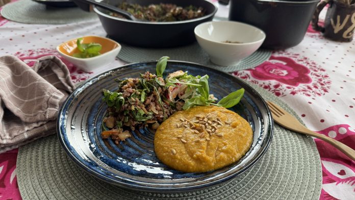 Rychlé a lahodné, přirozeně bezlepkové jídlo plné kontrastních chutí, o které se postará dýně, umeocet a kysané zelí.