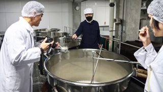 Tohle byla naše první návštěva výrobny v Japonsku vůbec. Fukumitsuya má už 400 let sídlo v Kanazawě a jak jsme dozvěděli, díky zdejšímu jedinečnému zdroji stoleté vody (víc než sto let totiž dešťová voda stéká přes různé vrstvy do hlubin země, odkud ji výrobna získává) se ani nemůžou přestěhovat. Mimochodem Kanazawa je neskutečně krásné město a vyplatí se ho zařadit do programu, pokud Japonsko navštívíte.