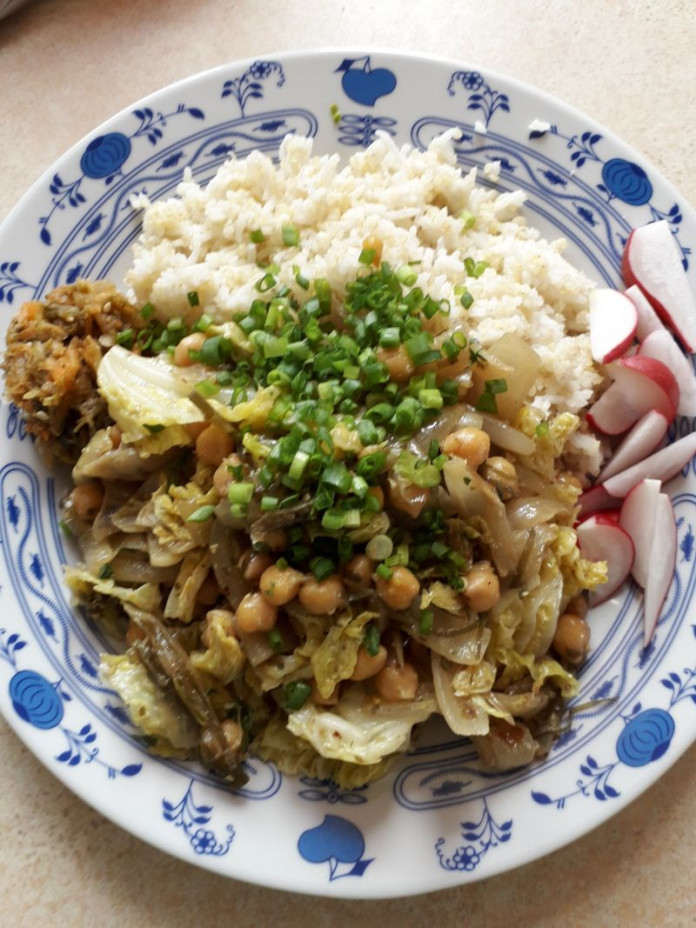 - Až bude cibule zlatavá, přidáme kapustu a koření a na mírném plameni restujeme.