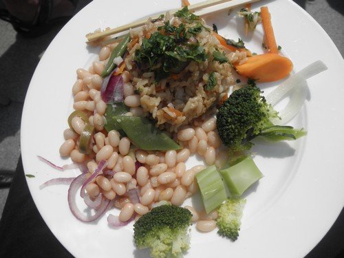 Rizoto se sušenými rajčaty a česnekem, posypáno petrželkou, salát z bílých fazolek, červené cibule, zelených fazolových lusků a oliv, napařená brokolice, pickles z mrkve.