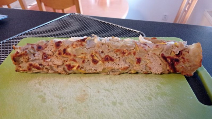 - Smícháme ingredience na roládu (směs by měla být trošku hustší), rozpálíme si hranatou pánev s olivovým olejem (používám čtveratý titanový hrnec ) a směs do ní vyklopíme, rozetřeme stěrkou na tenčí placku, pečeme asi 5 minut a poté opatrně otočíme a dopékáme asi 3 minuty. Hotovou placku vyklopíme na pečící papír a necháme zchladnout.