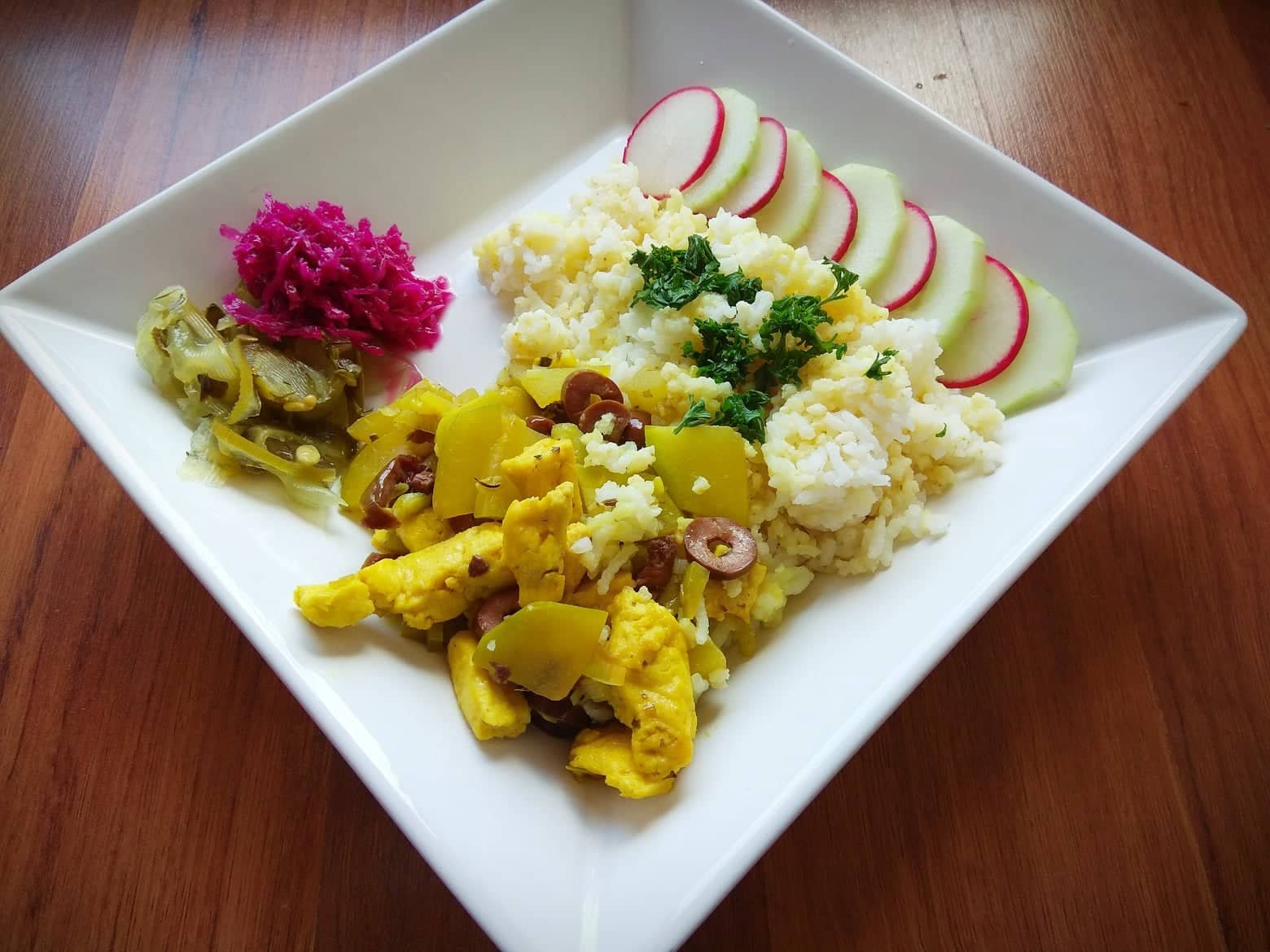 - Necháme chvilku dusit, než cuketa změkne. Mezitím si ohřejeme obilovinu (která nám zbyla z minulého dne), ozdobíme a rychlovka je hotova! :)