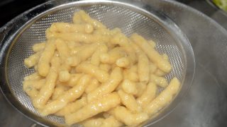 - Uveďte vodu do varu. Kouli těsta pomažte olejem a strojkem na brambory prolisujte těsto přímo do vařící vody. Vařte asi 4 minuty. Poté sceďte.