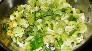 - Nasekejte bylinky. Nakrájejte pórek a rozeberte na růžičky romanesco.