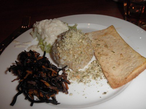 Celozrnná rýže posypaná gomasiem z dýňových semínek, “přírodní” osmažený tofu plátek, hiziky kondiment se sušeným daikonem, mrkví a zázvorovou šťávou, blanšírované zelí s dresingem z bílého tofu a nastrouhaného daikonu