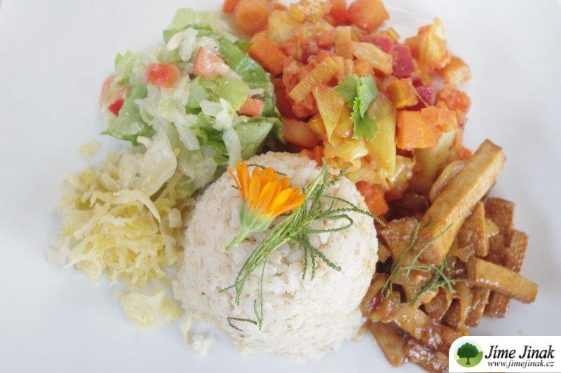 Rýže se slunečnicí, sladké zeleninové soté s tofu zeleninove sote, napařená zelenina, kvašená zelenina a salát z čerstvé zeleniny