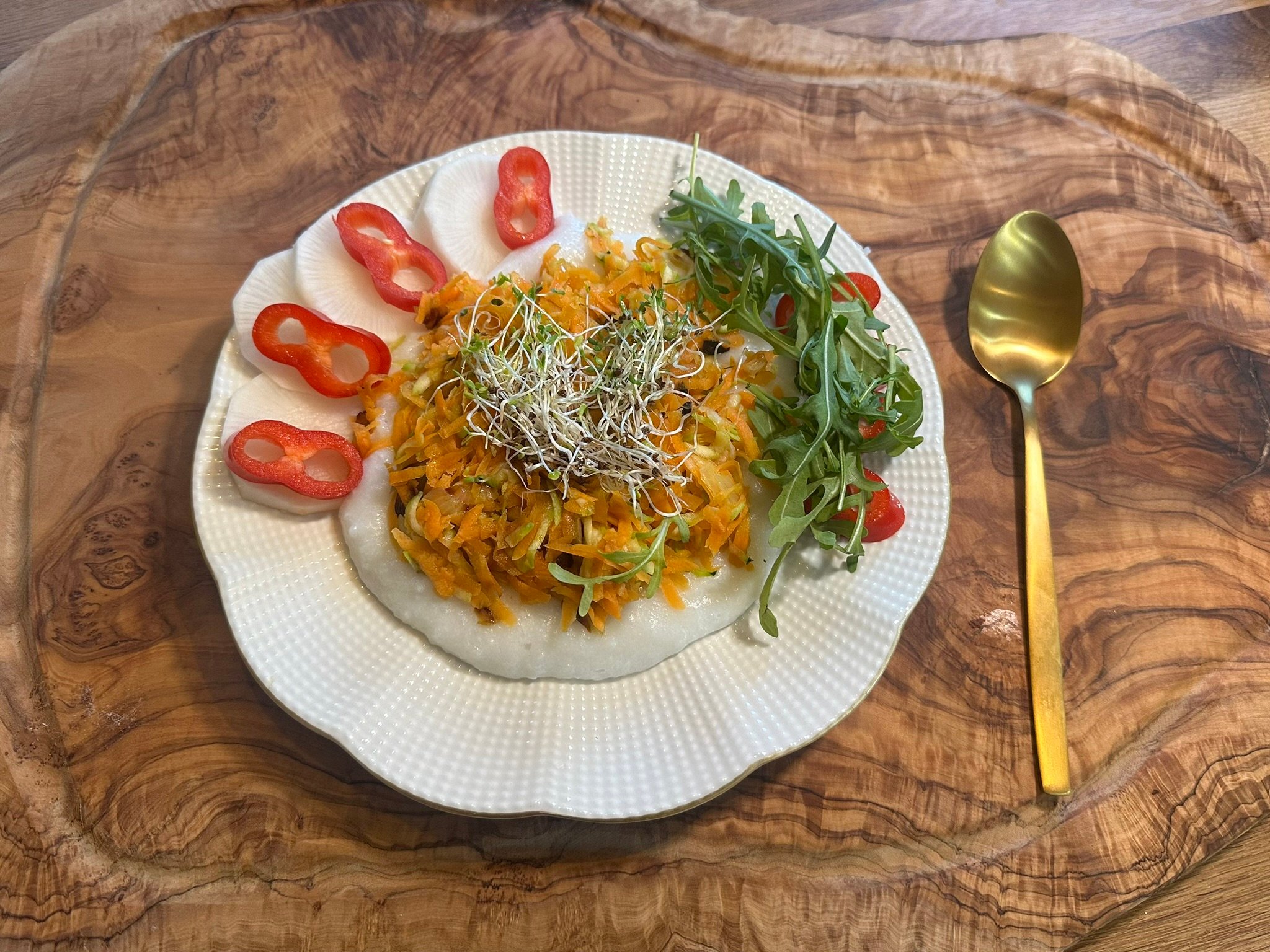 Jednoduché, výživné a velmi variabilní jídlo, které se hodí jako vydatná snídaně. Jemná rýžová kaše vytvoří krémový základ, který doplní podušená zelenina, čerstvé klíčky a semínka. Talíř pak krásně oživí čerstvá zelenina.