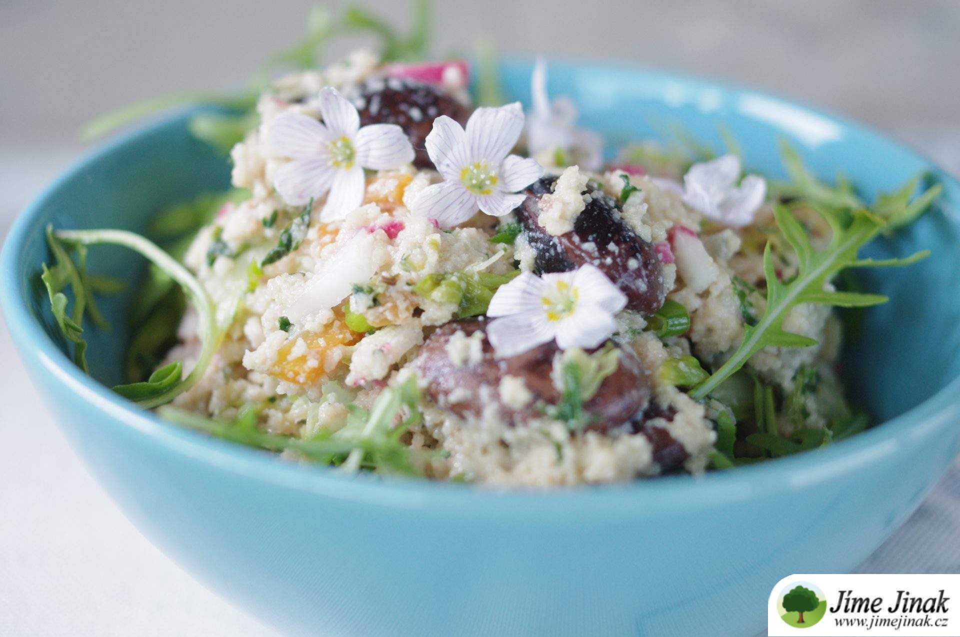 - Do hotové zeleninové směsi přidáme vařený kuskus, ředkvičky, tofunézu, vařené fazole a promícháme.