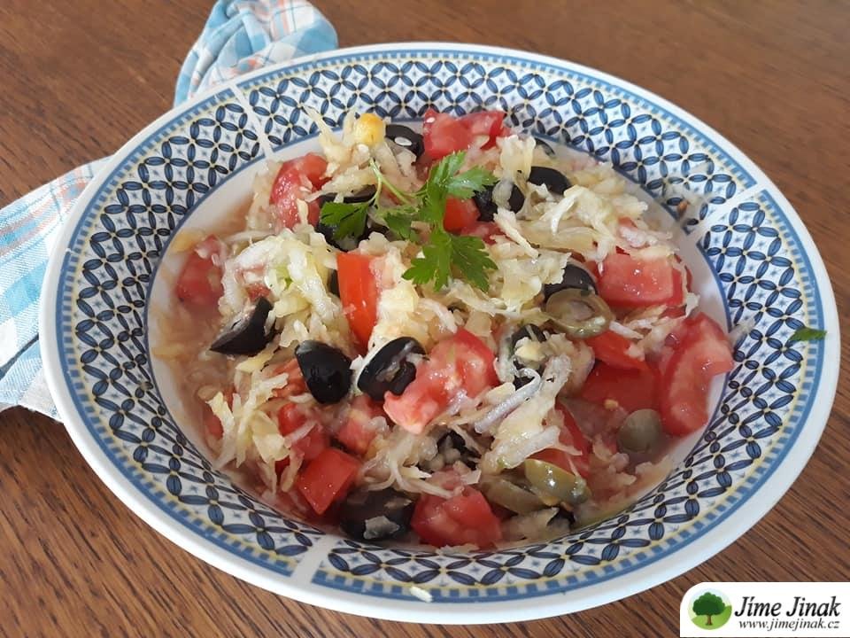 - Nastrouháme řepu a okurku nahrubo, rajčata pokrájíme na kostičky, olivy na kolečka.