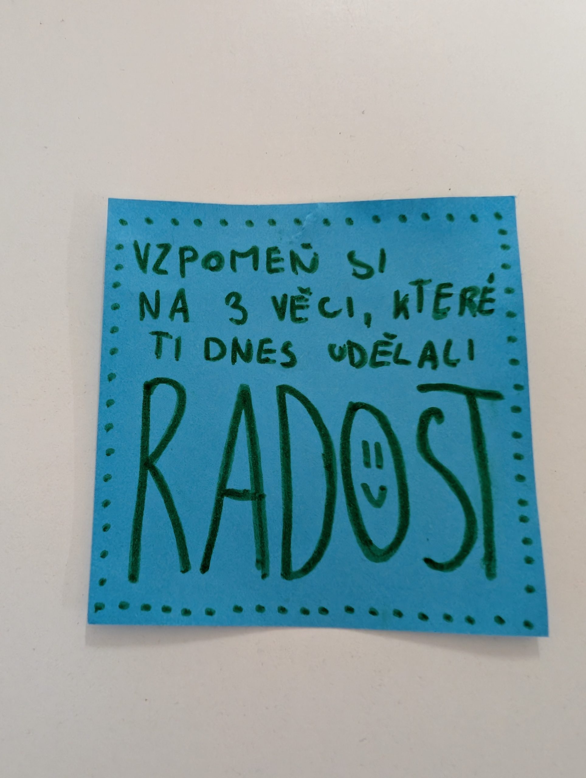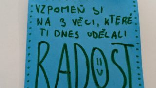 Stejně jako mě dojalo, když jsme s dcerkou přišly k zápisu do jedné svobodné školy a na stole hned vedle visaček „návštěva” byl malý papírek s dětským písmem a větou: „Vzpomeň si na 3 věci, které ti dnes udělaly radost.“ Ten papírek byl nakonec i důvodem, proč jsem článek po letech konečně dopsala.