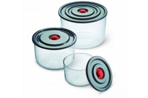 V eshopu najdete jak dózy s dřevěným víčkem (vhodné pro skladování suchých potravin), tak dózy s plastovým víčkem (vhodné pro skladování načaté zeleniny, zbytků obilovin apod.), kulaté i hranaté tvary. Perfektní jsou sady, co se dají skládat do sebe, protože nezabírají místo ve skřínkách. V zásobnících Pump & Pump (to jsou ty s červeným středem dole v galerii) můžete jak skladovat uvařené potraviny, tak je můžete používat v mrazáku.