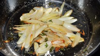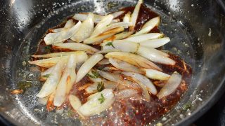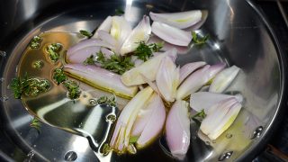 - Nakrájejte na plátky šalotku a dejte jí na olivový olej spolu se saturejkou a tymiánem. Lehce pečte, pomalu na nízkém plameni, dokud nebude šalotka lehce zkaramelizovaná.
