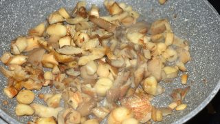 - Nakrájejte hlívu a nasekejte česnek. Dejte na pánev s olejem, přidejte kmín a osmahnout.