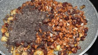 - Osolte, opepřete, přidejte fazole, špaldu, mletý mák a promíchejte.