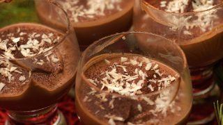 - Krém naplňte do pohárků, posypte karobem nebo kakaem a ozdobte kokosem.