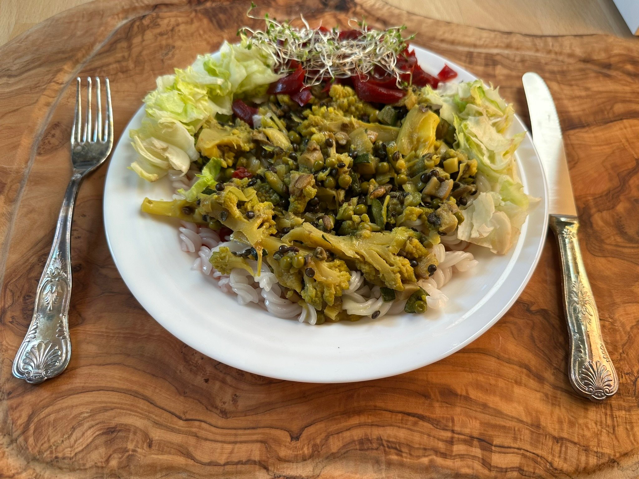 - Směs podáváme s uvařenými těstovinami. Na talíři doplníme čerstvým ledovým salátem, nudličkami červené řepy a hrstí klíčků.