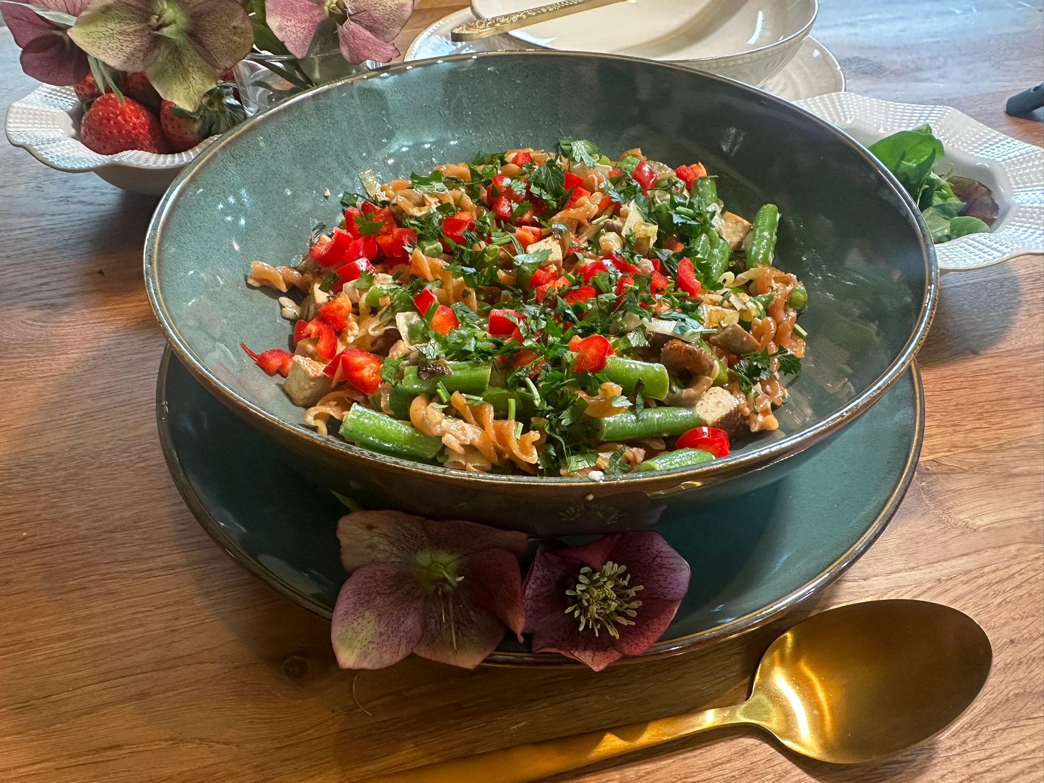 - Do směsi přidejte uvařené těstoviny a vše jemně promíchejte.