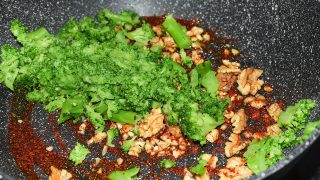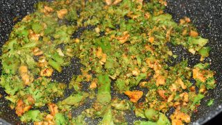 - Na pánev dejte olej, prolisovaný česnek, nasekané vlašské ořechy, brokolici, sůl a gochugaru a orestujte. Lehce osolte a promíchejte.