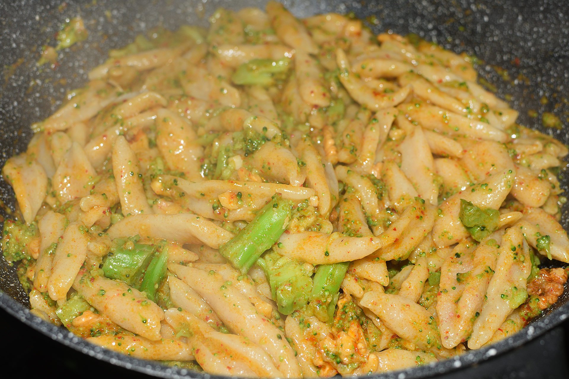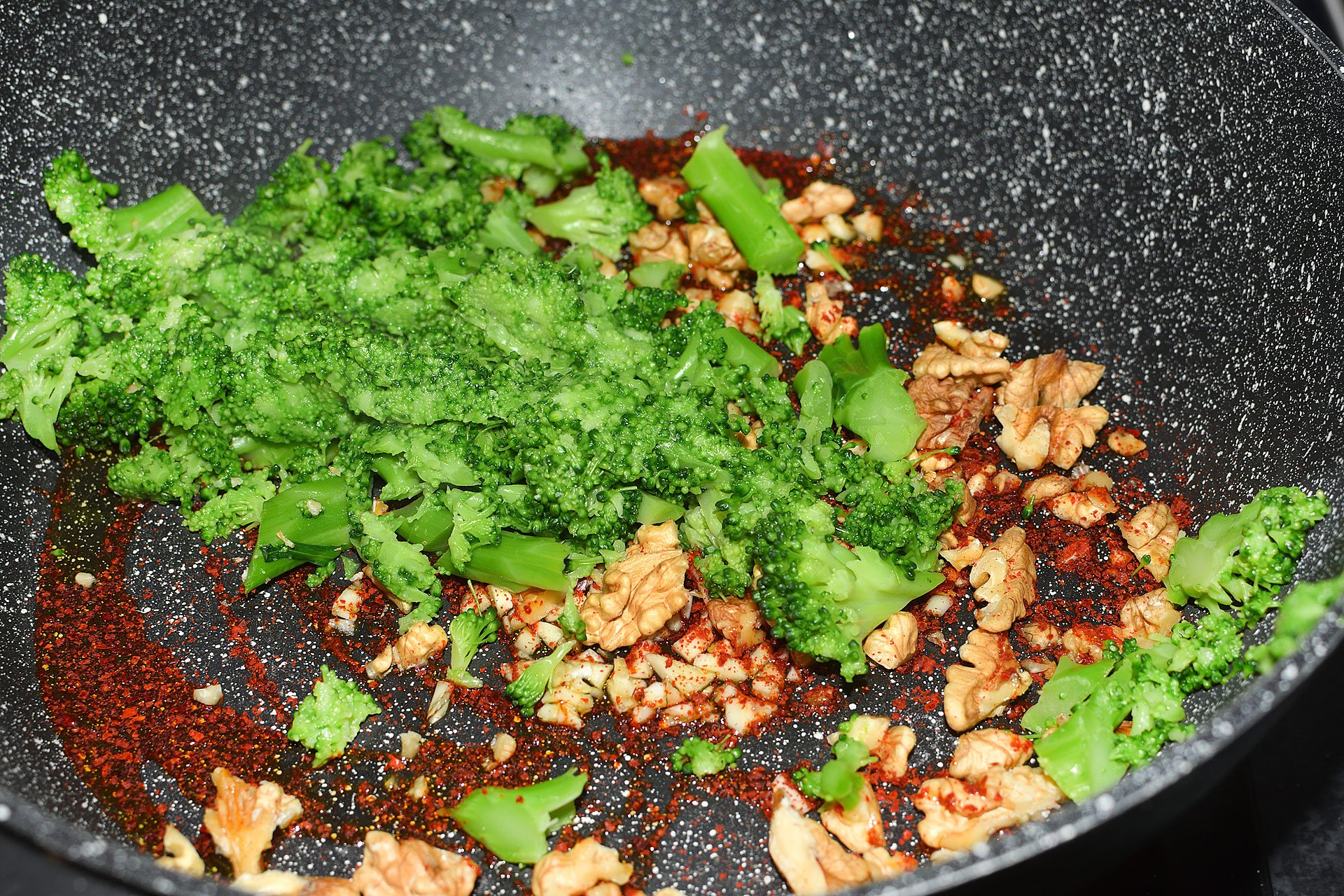 - Na pánev dejte olej, prolisovaný česnek, nasekané vlašské ořechy, brokolici, sůl a gochugaru a orestujte. Lehce osolte a promíchejte.