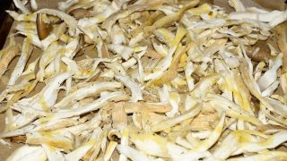 - Nožičky hlívy a trochu kloboučků natrhejte na dlouhé tenké pruhy.
