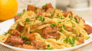 - Špagety uvařte, sceďte a vložte do pánve s kešu oříšky. Zvyšte teplotu a několik minut vařte, dokud omáčka nezhoustne. Přidejte tempeh a posypejte petrželkou a pořádnou dávkou černého pepře.