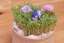 Hotová “vajíčka” můžeme jen tak naskládat do košíčků nebo je položit do zeleného osení. My jsme ho položili na řeřichu, protože osení jsme včas nezaseli a nebylo ještě pořádně vidět.