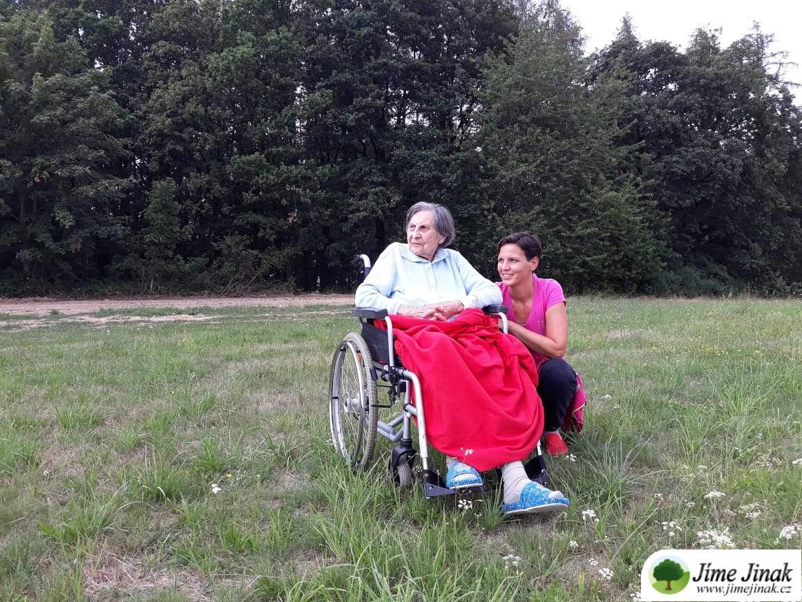 S chodítkem to tady vůbec nejde. Ani po trávě na zahradě, natož po kamenech na cestě před domem. A když vidíme, že babička je ochotná jít na terasu i dál, tak fofrem seženeme invalidní vozík a těšíme se, že ji vyvezeme kolem domu a budeme ji moci ukázat les, louky, vesnici a život tady kolem nás. To jsme ale netušili, jak nepraktický takový vozík je. Po zahradě s ním neujedu sama ani metr. Roman je silnější a babičku na něm dopraví aspoň k houpačce, kde babi usne a on jí tam s počítačem na klíně o sebe zapřenou hodinu a půl hlídá, aby nespadla.