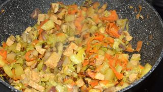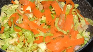 - Veškerou zeleninu a hlívu nakrájejte na malé kousky, mrkev na tenké plátky, dejte na pánev s olejem a orestujte.