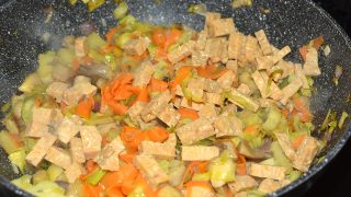 - Jakmile je vše měkké, přidejte na kostičky nakrájený tempeh, osolte, opepřete, promíchejte a znovu orestujte.