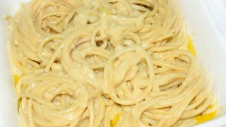- Uvařte těstoviny al dente, sceďte, dejte do hrnce a promíchejte s lahůdkovým droždím a bešamelem.