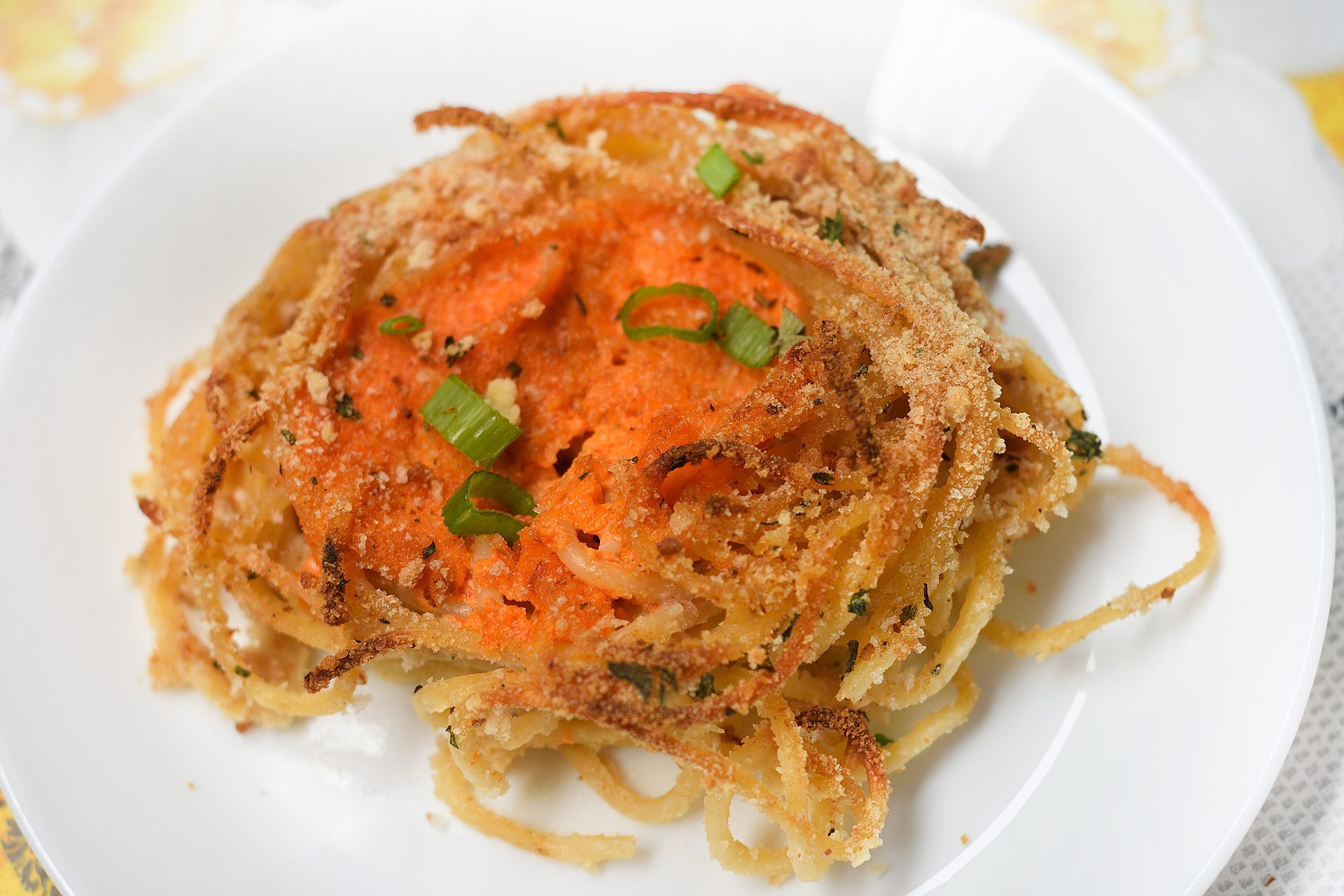 • Nemusíte ani tvořit hnízda. Špagety jednoduše dejte na pekáček a polijte rozmixovanou zeleninou. Nožem pak nakrájejte na kusy.