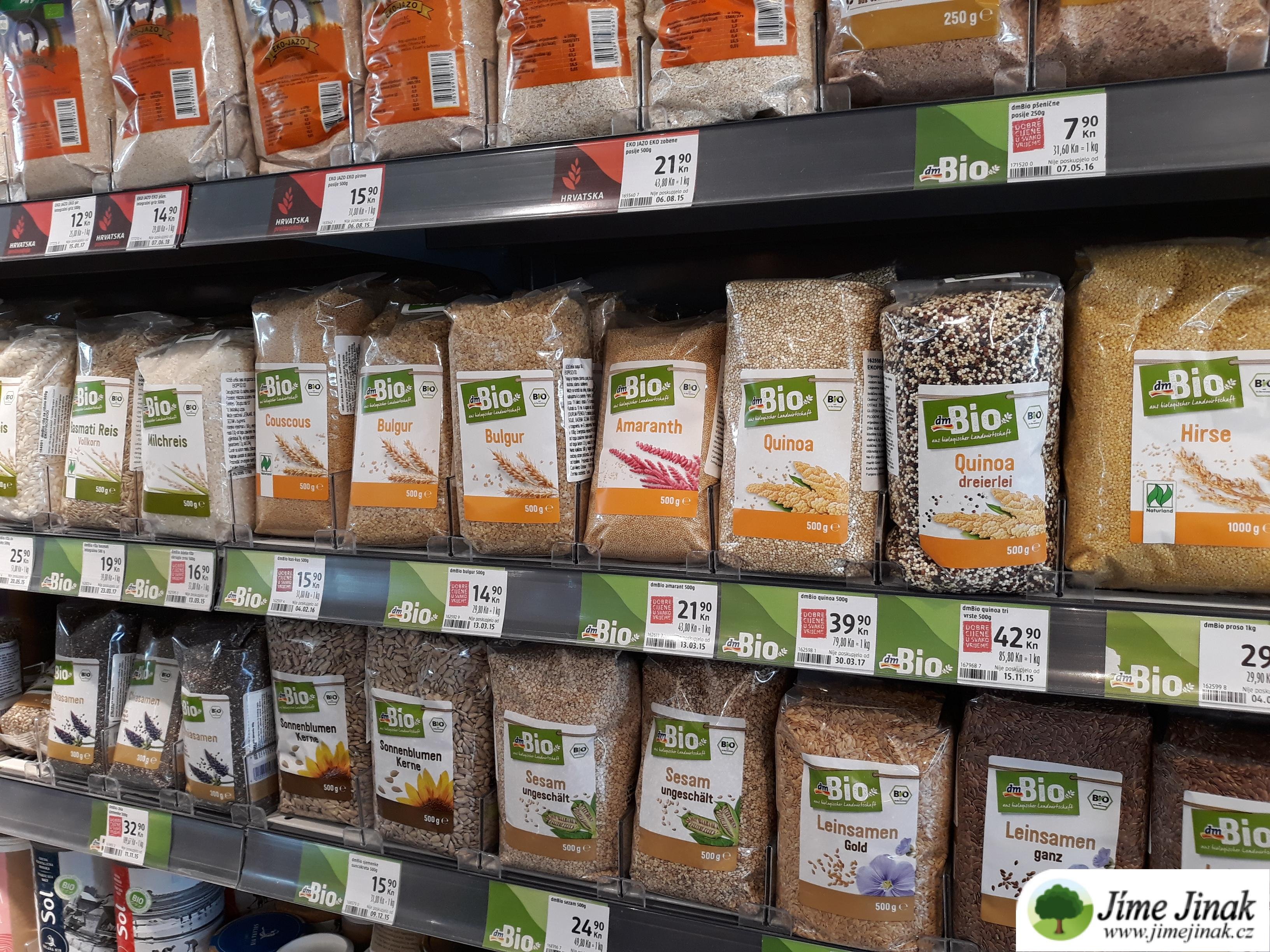 Pokud potřebujete doplnit zásoby zdravého jídla, doporučujeme navštívit DM drogerii, kde seženete vše od obilí, přes luštěniny, speciální mouky, pudinky, oleje, semínka, oříšky, pomazánky, tofu, dochucovadla, sladidla a téměř cokoliv, co si vzpomenete (sortiment je podobný jako v našich DM drogeriích), většinu požadovaného zboží dostanete v BIO kvalitě, ale připravte se na to, že si připlatíte. Ve větších obchodech typu Tommy (také Konzum a Studenac) nakoupíte základní suroviny jako čočka, fazole, cizrna, pohanka, oves, kroupy, polenta, kukuřičná mouka, bezlepkové pečivo, žitné balené chleby, ajvary, v některých obchodech mají i jáhly. Ve většině z nich naleznete i rýžová, sojová a kokosová mléka (např. Alpro). Síť obchodů Konzum má vlastní biokoutek, kde seženete BIO luštěniny, obiloviny, mléka, marmelády, sušenky a další dobroty. V Kauflandu najdete široký sortiment zdravé výživy – od různých pomazánek, přes BIO ingredience (obiloviny, luštěniny, semínka, oříšky, mouky, mléka i BIO zeleninu). Zdravé výživy (seznam obchodů se zravou výživou) jsou především ve velkých městech, nejvíce ve Splitu a Záhřebu.