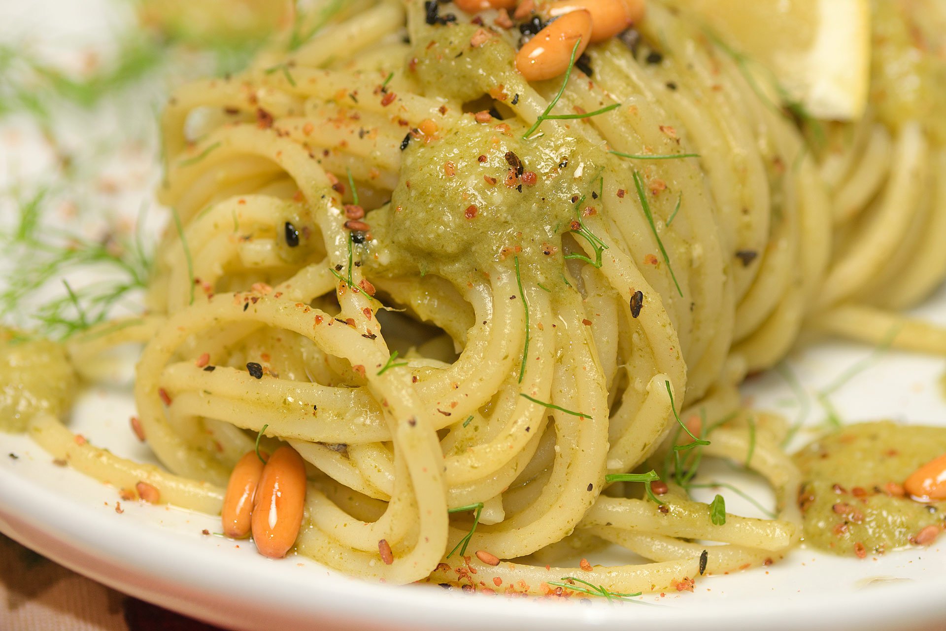 - Pokud chcete krém použít na těstoviny, uvařte si špagety a dochuťte je krémem. Na talíři špagety pokapejte aromatickým olejem se semínky a piniovými oříšky, ozdobte fenyklovými lístečky, gomasiem a pár kapkami citronu.