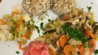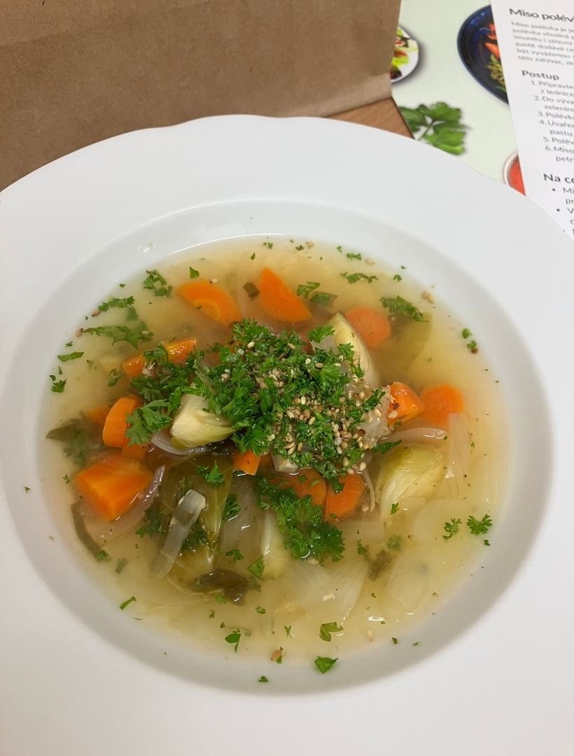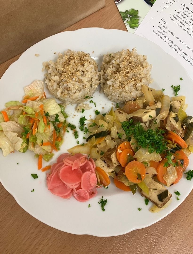 Vařili jsme opravdu naplno. Společně jsme připravili nejen základní miso polévku a kompletní hlavní chod, ale i pickles, salát a gomasio. Během celého vaření jsem se účastníkům snažila předávat své dlouholeté zkušenosti, upozorňovala na klíčové kroky u jednotlivých receptů a zároveň vysvětlovala, co si mohou v kuchyni zjednodušit. Velký ohlas vždy vzbudí tipy, jak některé části menu připravit dopředu nebo ve větším množství, aby člověk ušetřil čas a přitom jedl pořád zdravě. Velký úspěch měla sezamová sůl, tzv. gomasio, která provoněla celý prostor. Na závěr jsme si všechno, co jsme společně uvařili, s chutí snědli u jednoho stolu.
