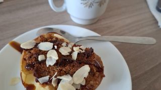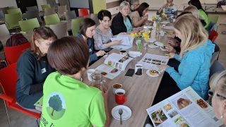 Hned na začátku jsme si zpříjemnily chvíle teplým dezertem a hrnkem obilné kávy. Vznikla tak milá a uvolněná atmosféra, která nás provázela po celý zbytek dne. Slunečné počasí nám navíc umožnilo pořídit několik společných fotografií, než jsme se přesunuly k hlavnímu dění – ke kuchyňské lince, kde jsme strávily většinu času.